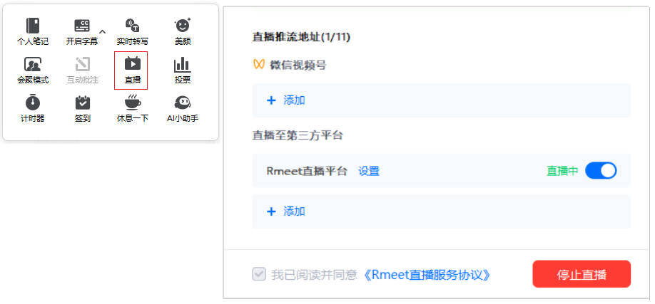视频会议支持一键推流至Rmeet直播平台,打破系统限制,实现集团内外用户全域观看。