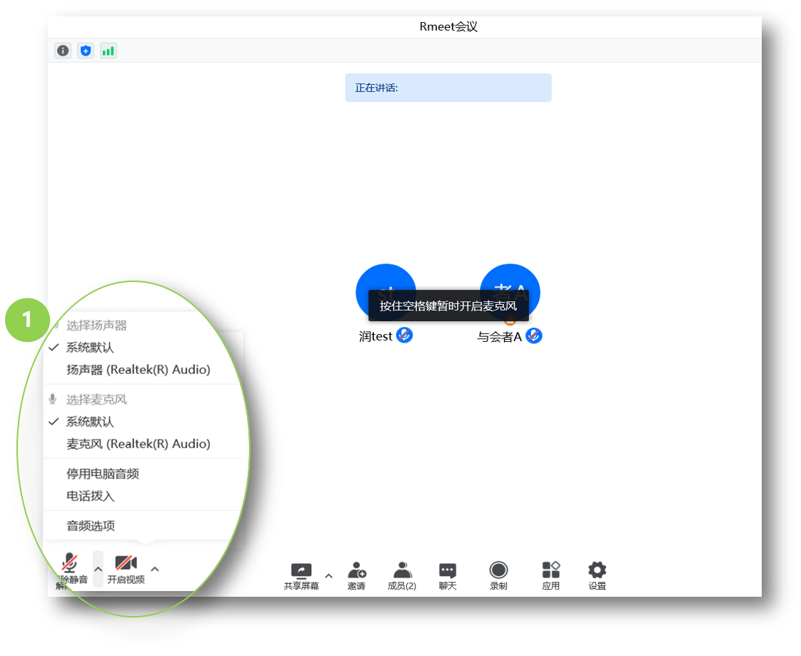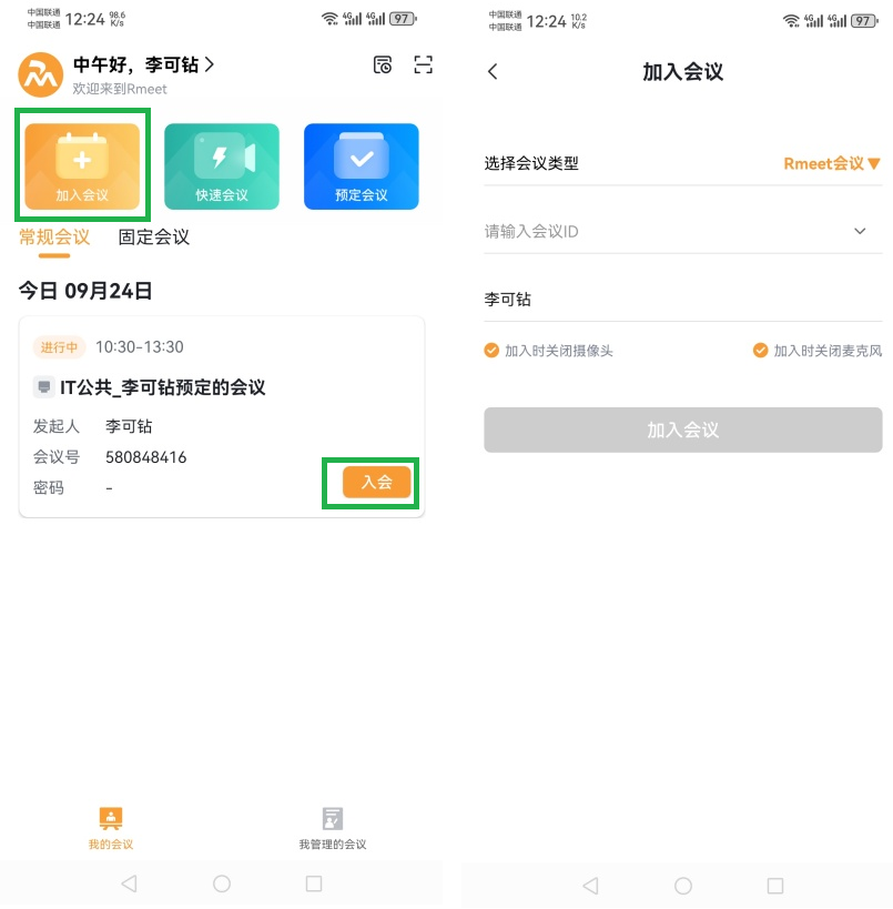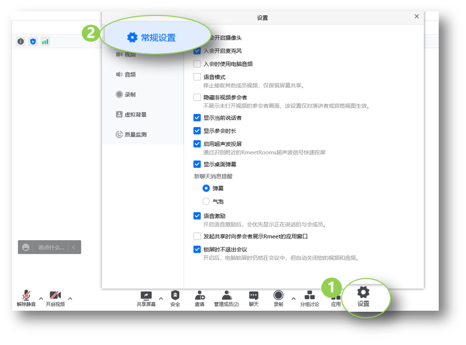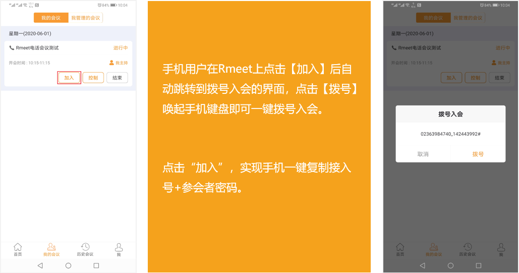 ①通过Rmeet手机客户端一键入会