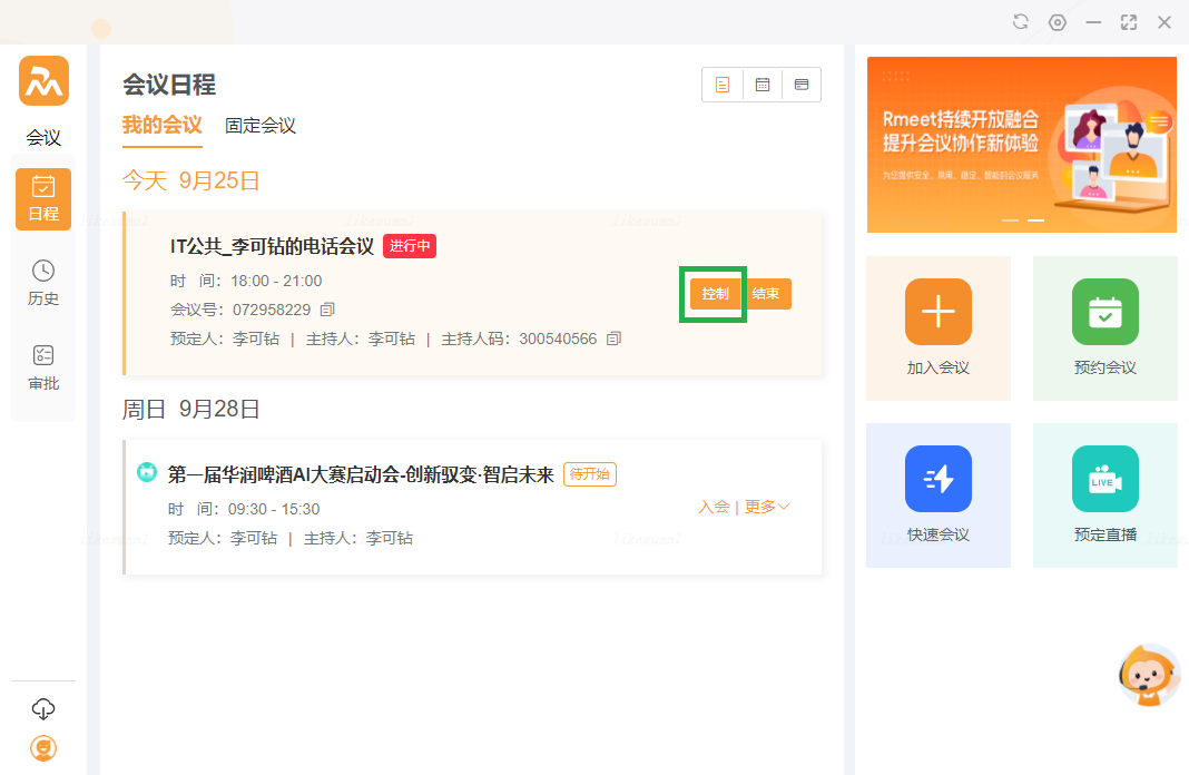主持人进入我的会议,找到对应的会议,点击【控制】即可进入会控界面: