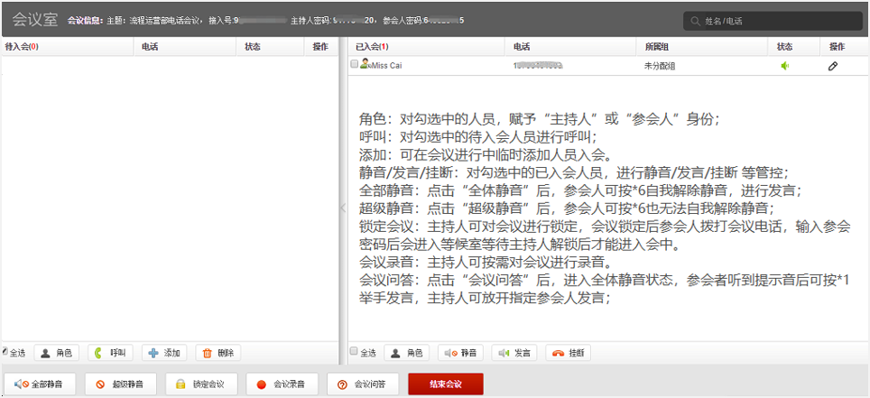 会议进行中,用户可以通过电话号码按键进行自助服务:
