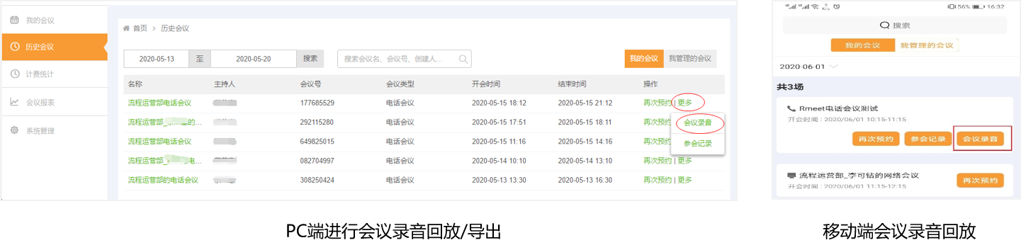用户通过PC端可以进行会议录音回放和导出(仅自己作为主持人的会议),选择【历史会议】——【更多】——点击【会议录音】,即可回放和导出;