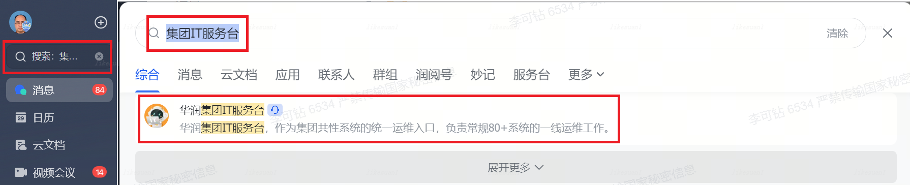 ①润工作搜索框输入:集团IT服务台,并点击进入