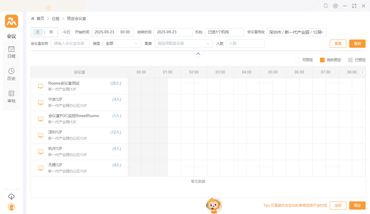 ⑵选择所在机构和区域的会议室,并选择空闲时间段进行预定:
