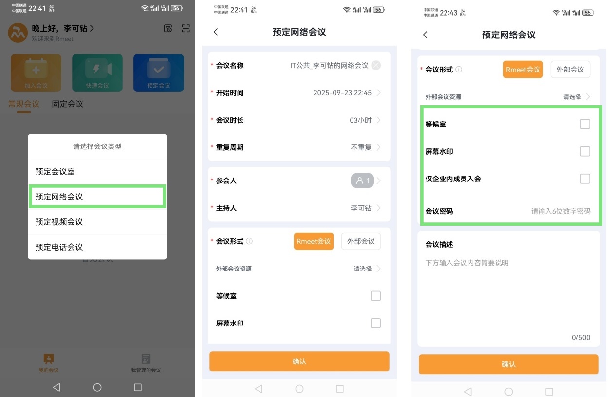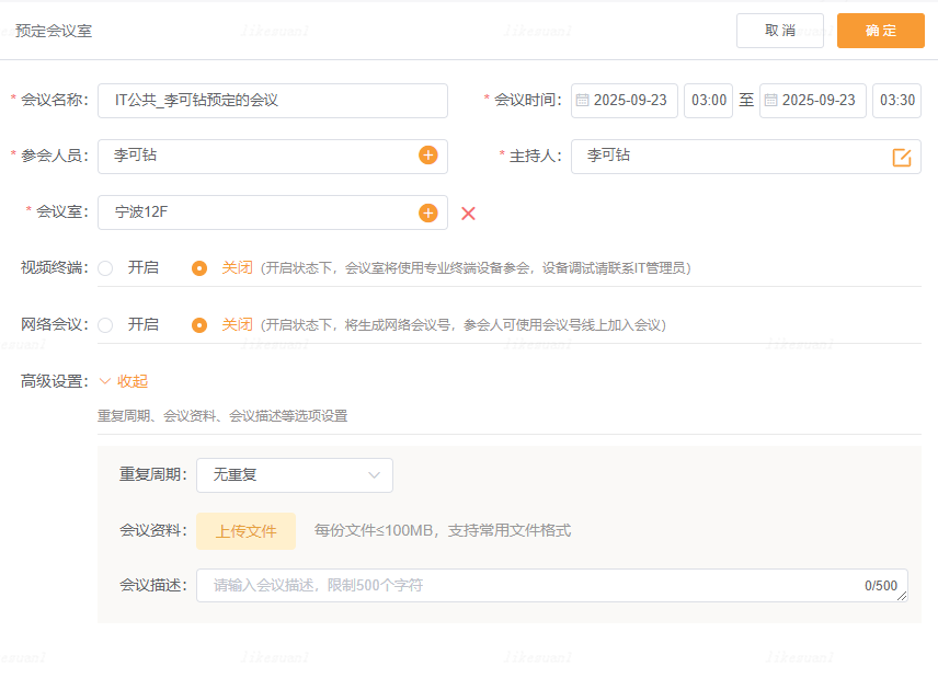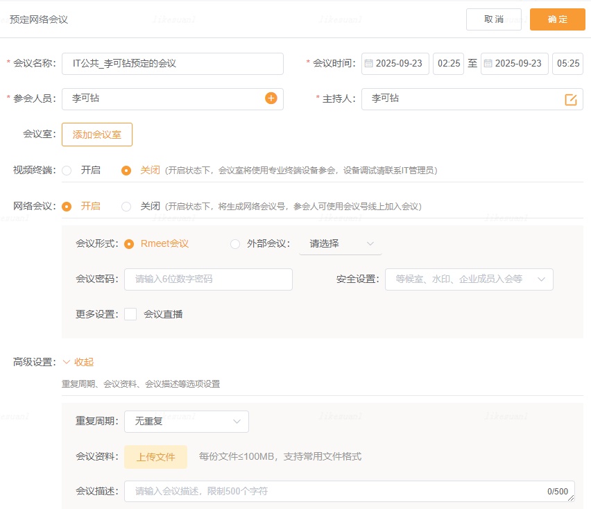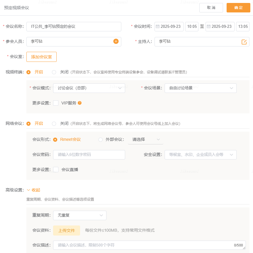 - 会议室,本地会议,预定时可同时开启预定网络会议和视频会议功能;