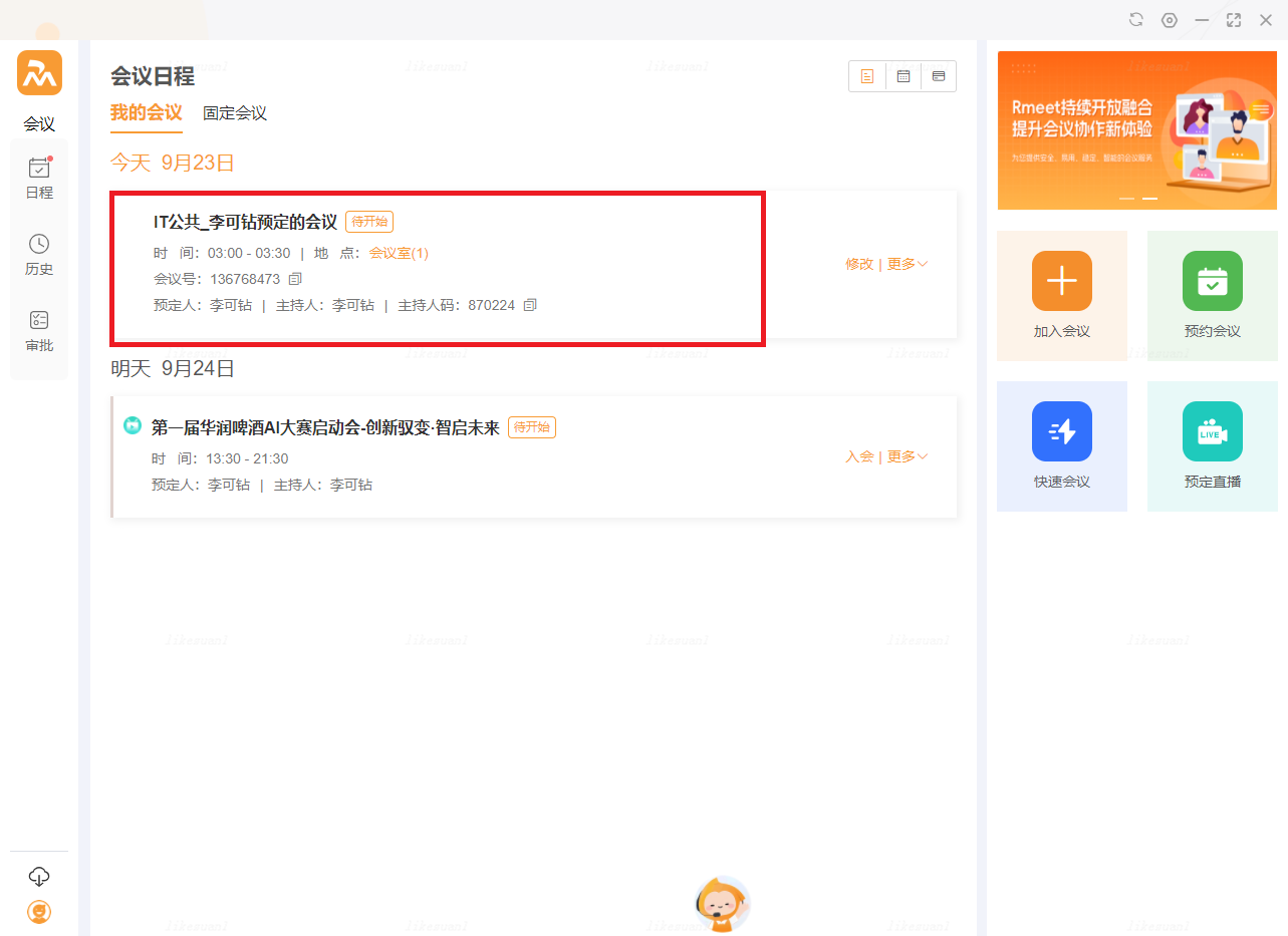 ⑷会议预约成功后,可在我的会议列表中看到刚才预约的会议信息: