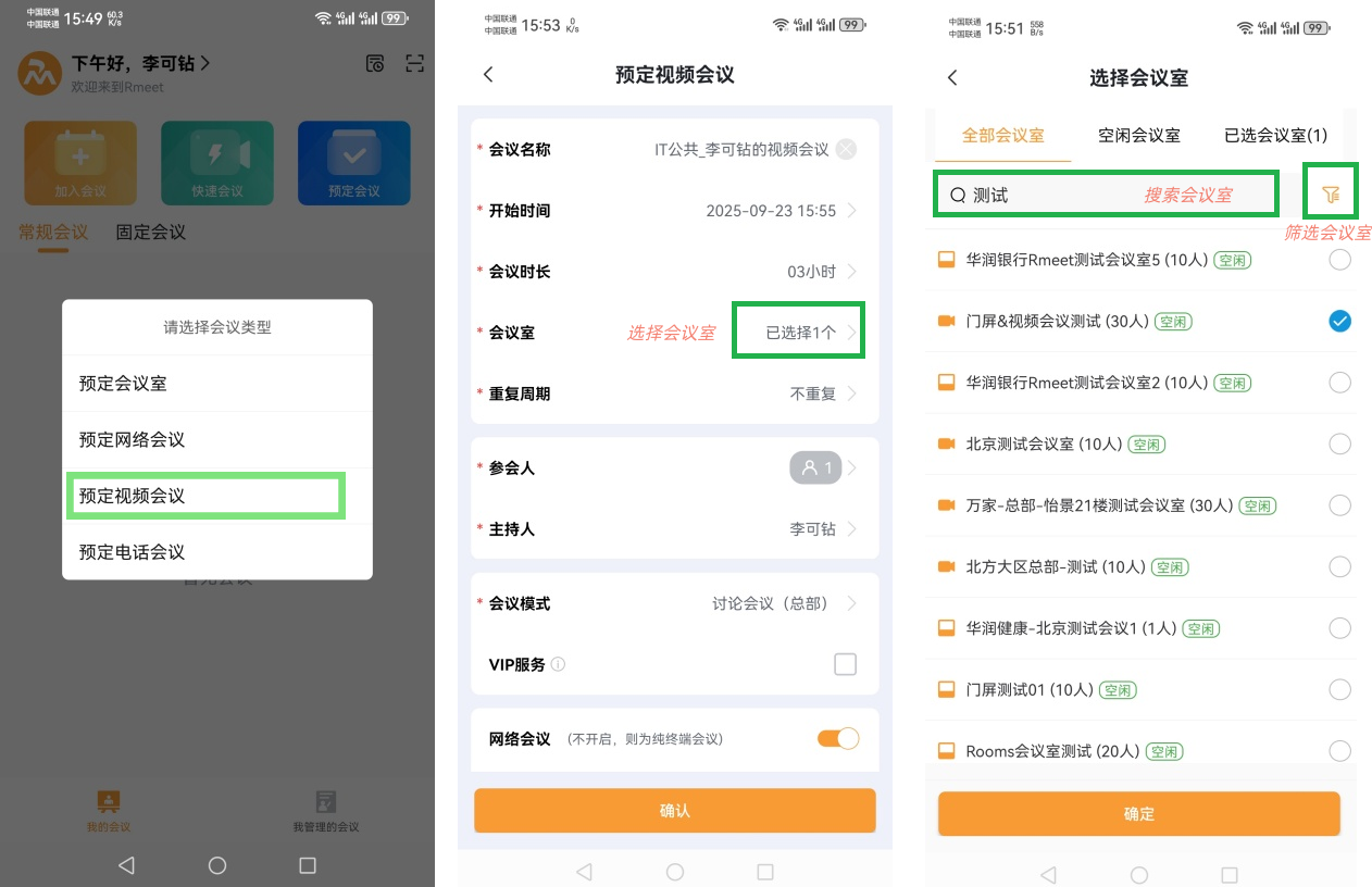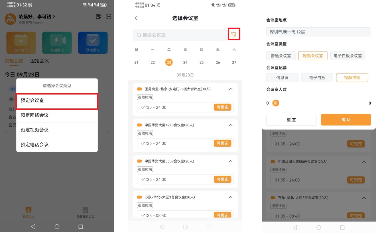 ⑴选择【预定会议室】 ⑵搜索或者筛选想要预定的会议室 ⑶选择会议室点、类型、配置等