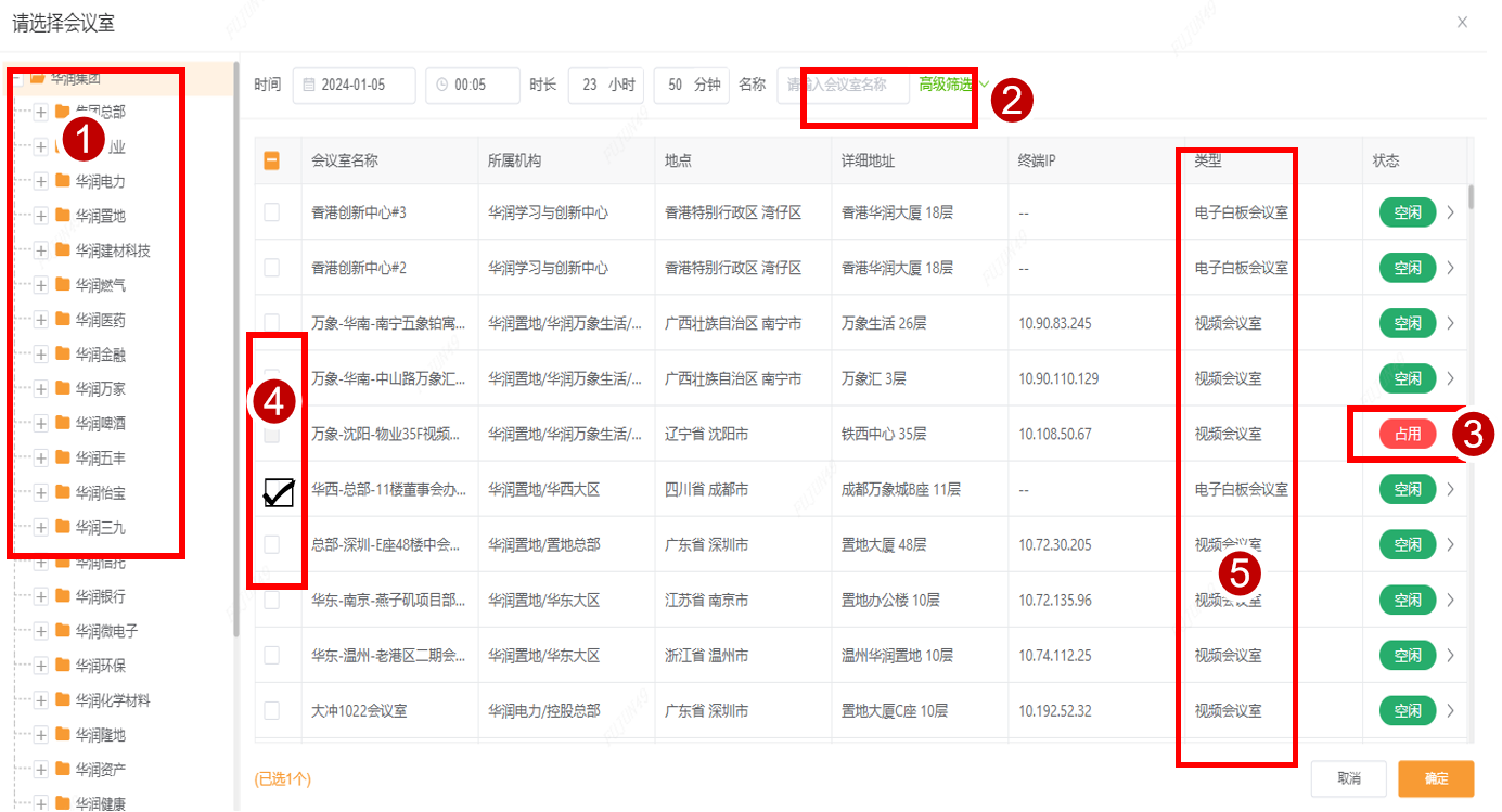 ⑷选择系统匹配的会议室 ⑸填写相关信息预定会议室