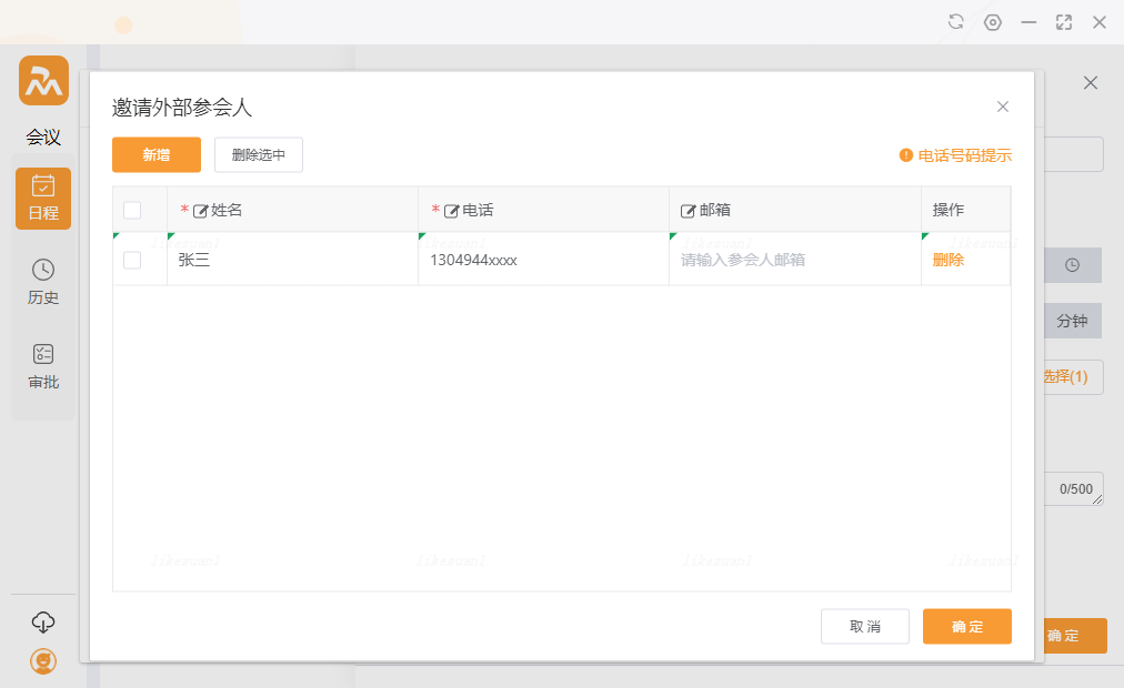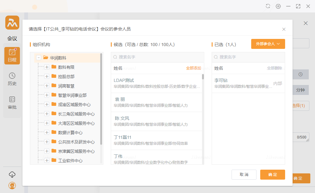 - 普通用户预定会议选择参会者:本单位最多可选50人,外单位最多可选10人