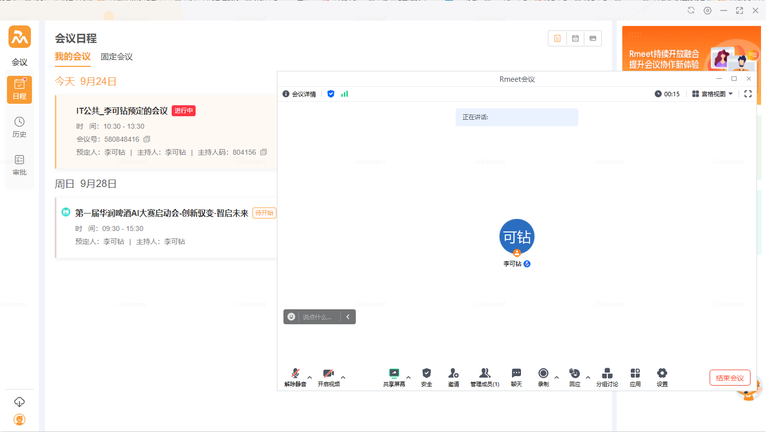 - Rmeet主持人控制会议时,如果临时退出会议,离开会议前务必将主持人权限转交给其它同事做会控。