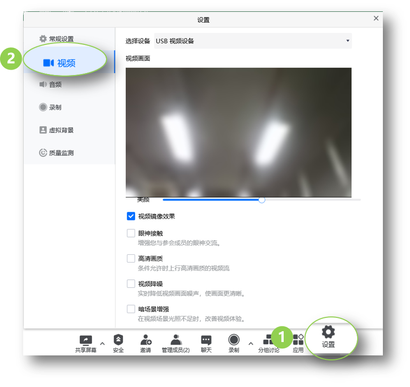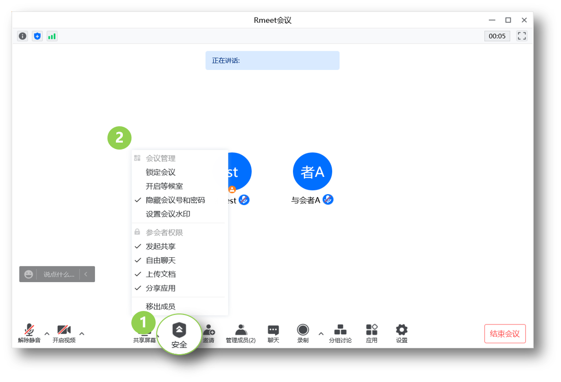 点击下方工具栏【安全】,进行设置: 1、会议管理: 1. 支持锁定会议 2. 开启等候室 3. 隐藏会议号和密码 4. 设置会议水印 2、参会者权限: 1. 发起共享 2. 自由聊天 3. 上传文档 4. 分享应用 3、移出成员