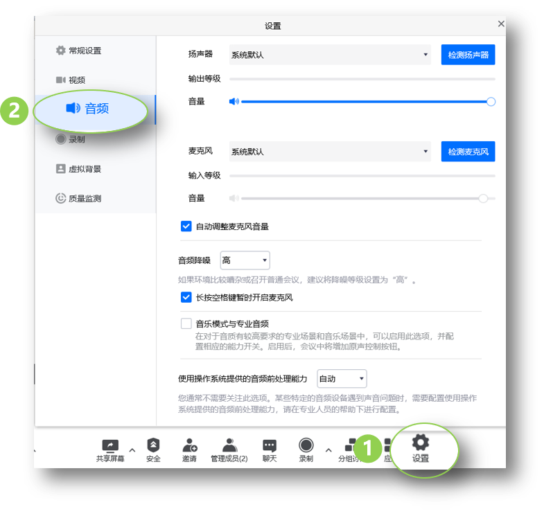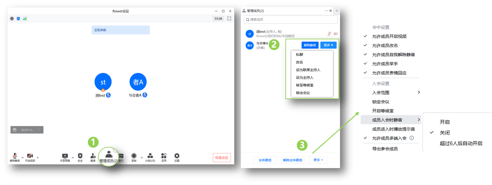 - 工具栏下方,可【全体静音】,【解除全体静音】,【更多】:允许成员自我解除静音、入会设置(锁定会议、开启等候室、成员进入时播放提示音、入会成员限制、成员入会时静音、导出参会者)