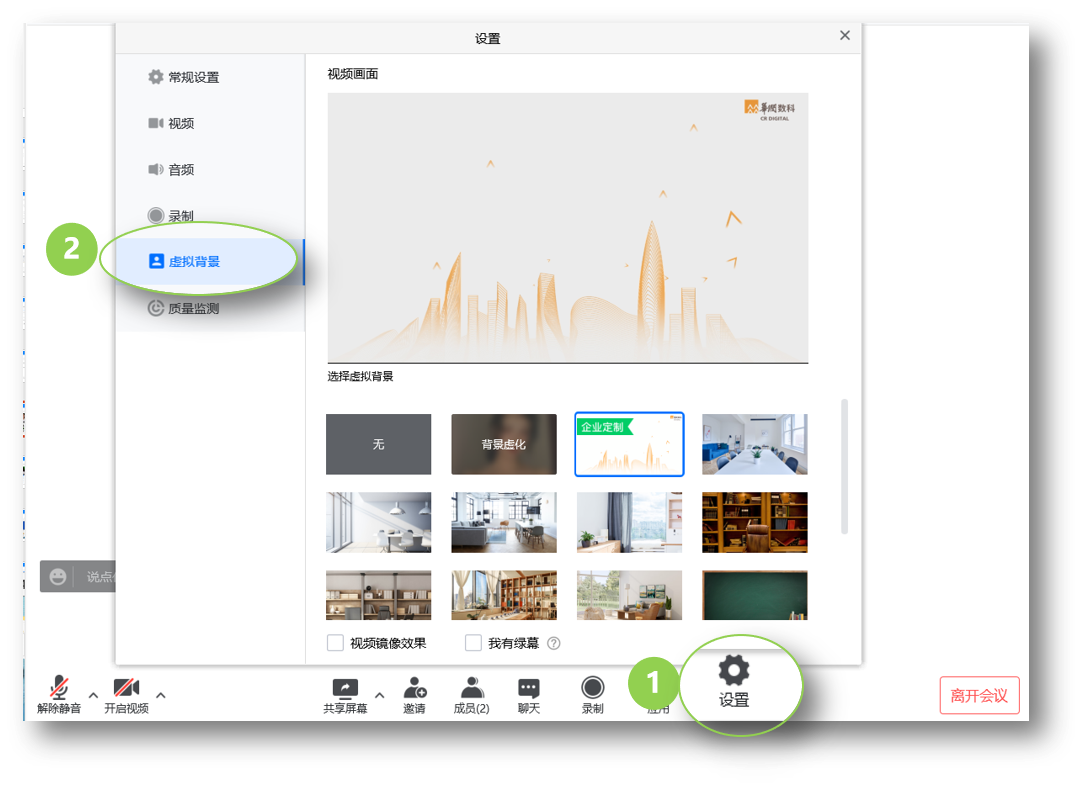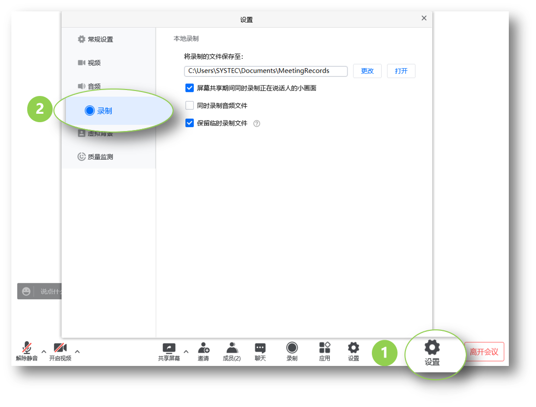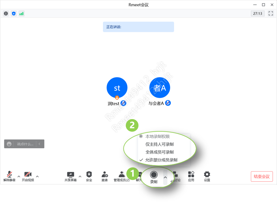 点击【录制①】-【本地录制权限②】,可以设置仅主持人、全体成员、允许部分成员录制权限。