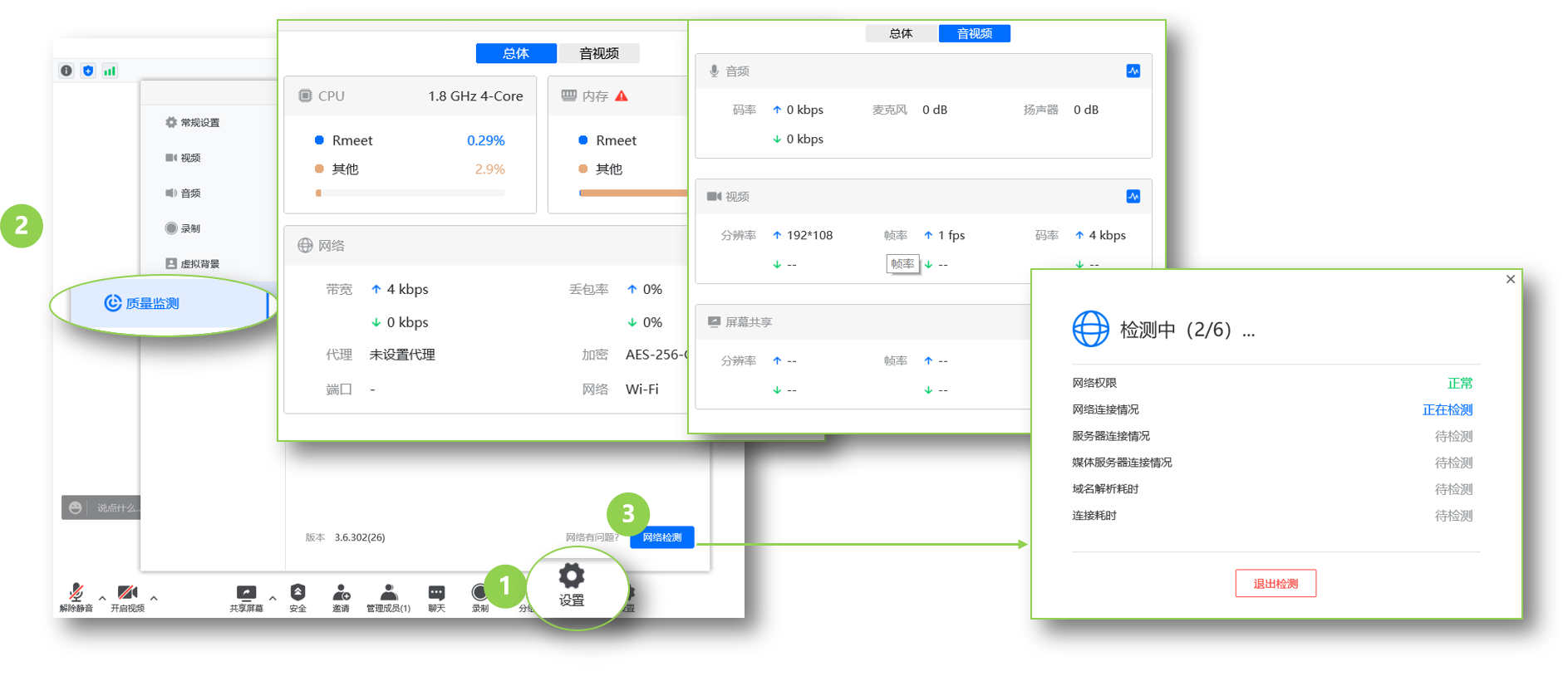 MCU的参会方保持声音开启,摄像头开启,不得踢出会议。页面控制也必须保持②的Rmeet级联点连接状态,不得静音,禁止屏蔽声音/摄像头。
