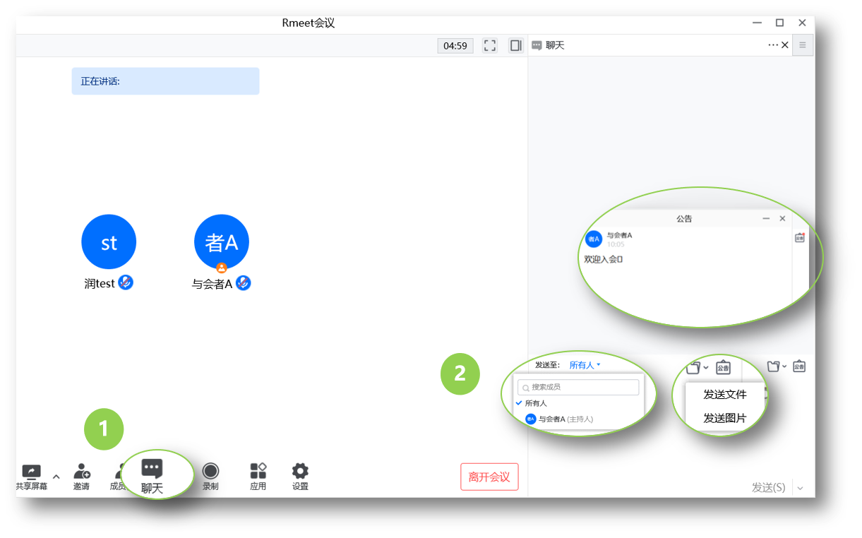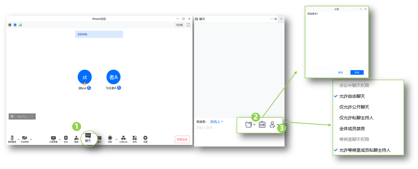 - 设置会议中聊天权限【允许自由聊天、仅允许公开聊天、仅允许私聊主持人、全体成员禁言】