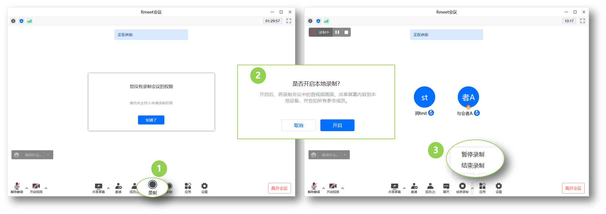 会中工具栏,点击【录制】,需要主持人开启录制权限,开启后: