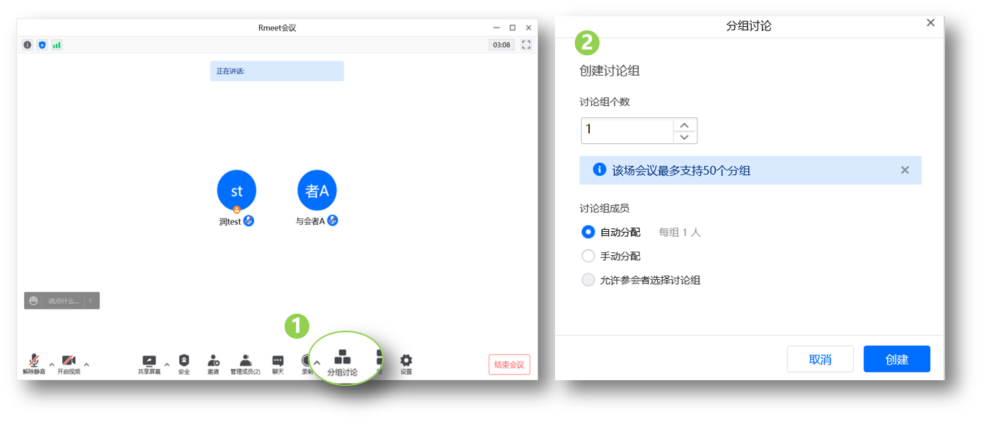 - 讨论组成员:自动分配、手动分配、允许参会者选择讨论组