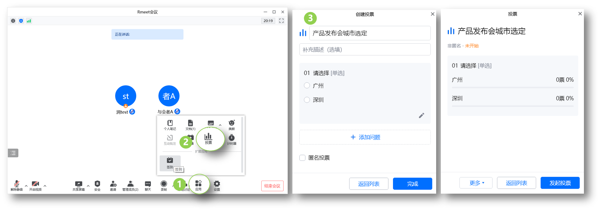 - 发起和终止投票:编辑好投票内容后,单击发起投票即可将所创建的投票发送至所有参会成员。还可以单击更多选择编辑投票、删除投票操作现有投票。