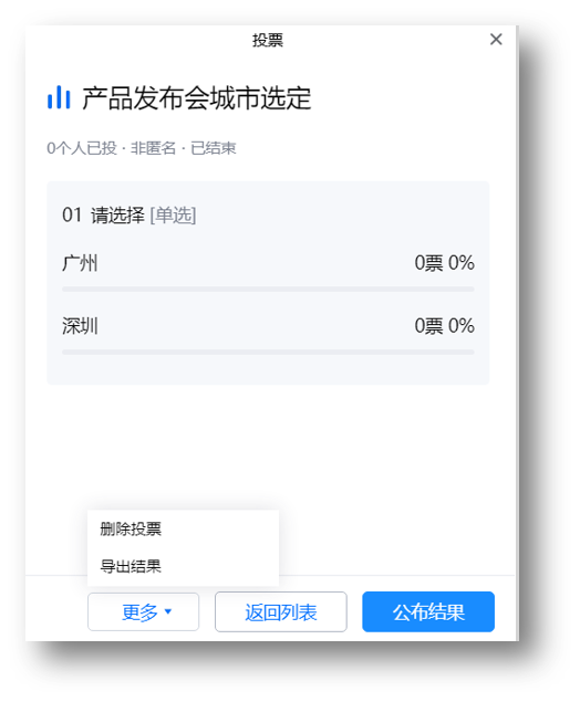 - 公布投票结果:对于已终止的投票,单击公布结果即可将投票结果(包含选项票数、百分比)公布给所有参会成员。