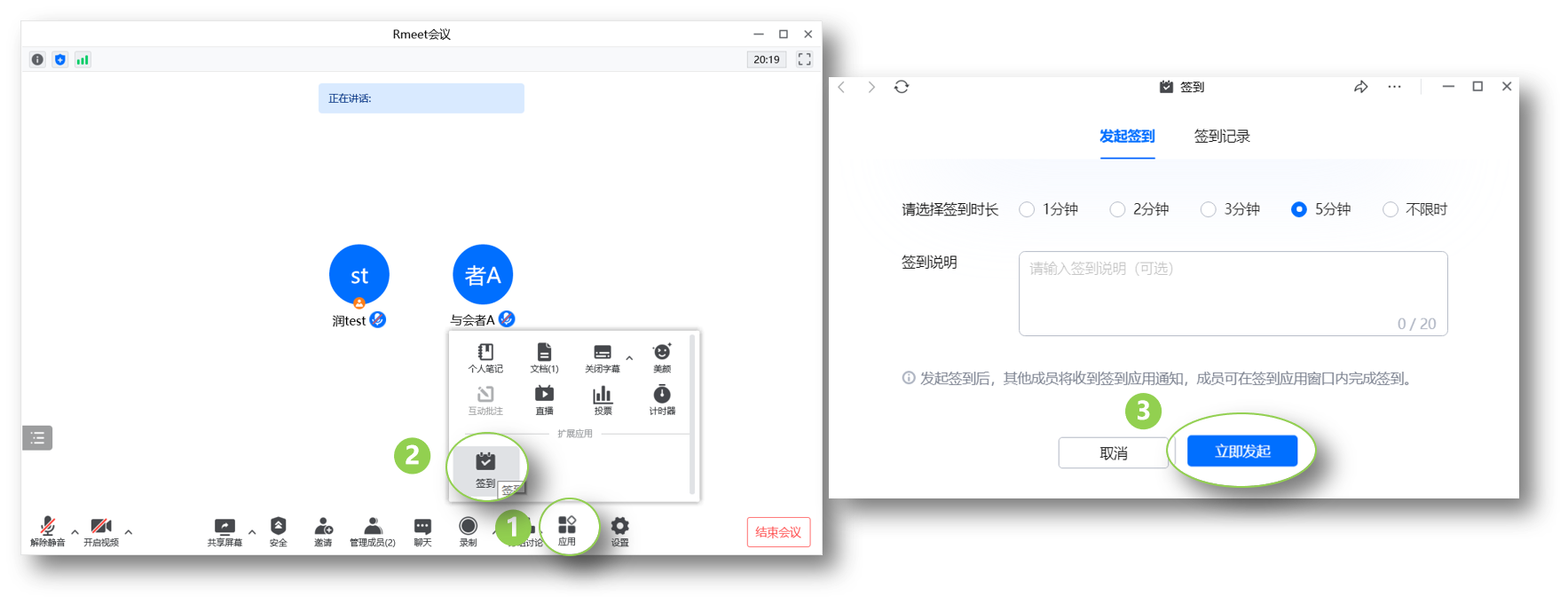 点击【应用①】-【签到②】,主持人可【立即发起③ 】签到。