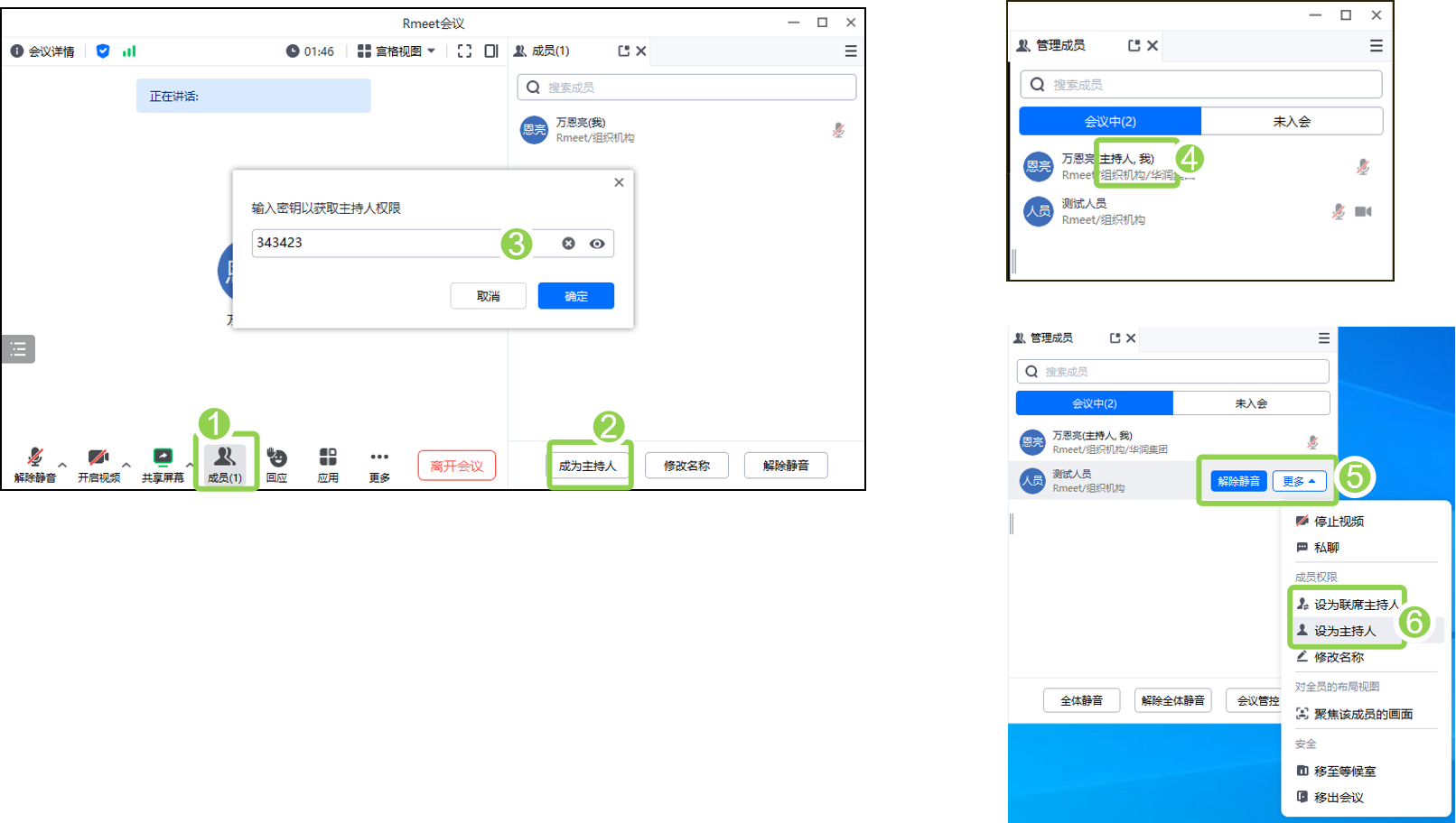 【主持人权限获取】参会者进入会议后:选择①【成员】,点击②【成为主持人】,输入③【主持人码】后成为④主持人。⑥主持人可以设置其他人为联席主持人或者将主持人权限转移给其他人。
