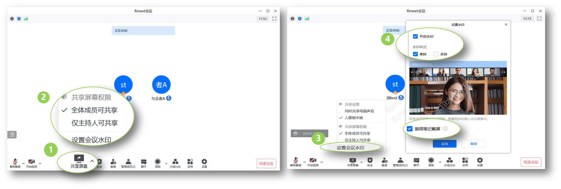 - 设置会议水印,点击【开启水印】,支持单排、多排水印、禁用笔记截屏。