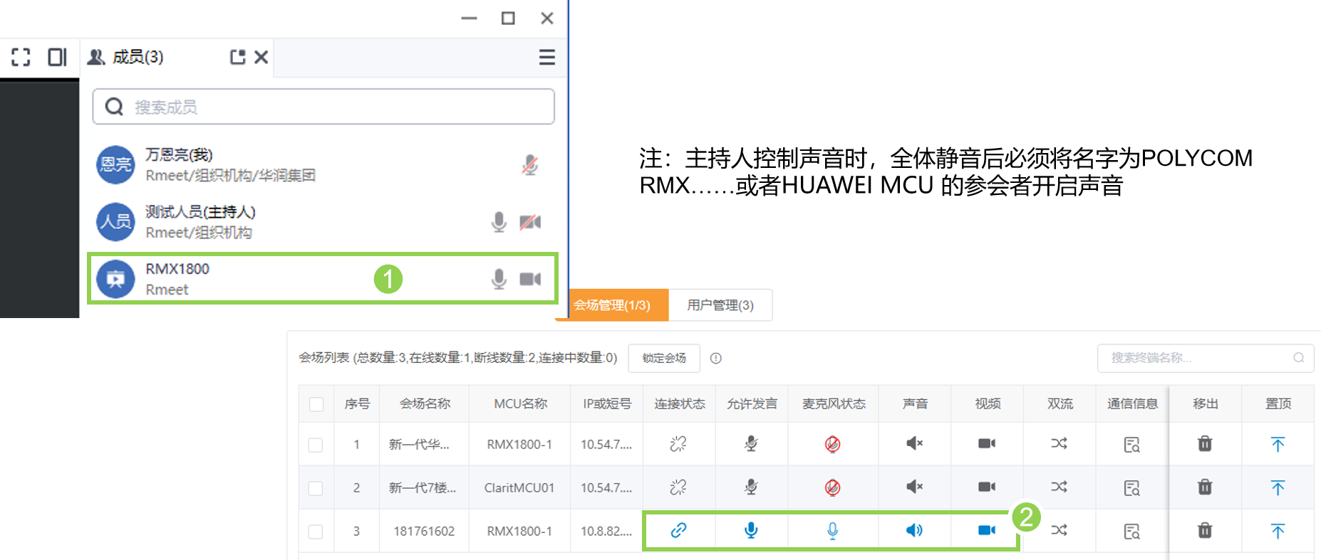 Rmeet主持人控制会议时,必须保持①的名字为POLYCOM RMX……或者HUAWEI