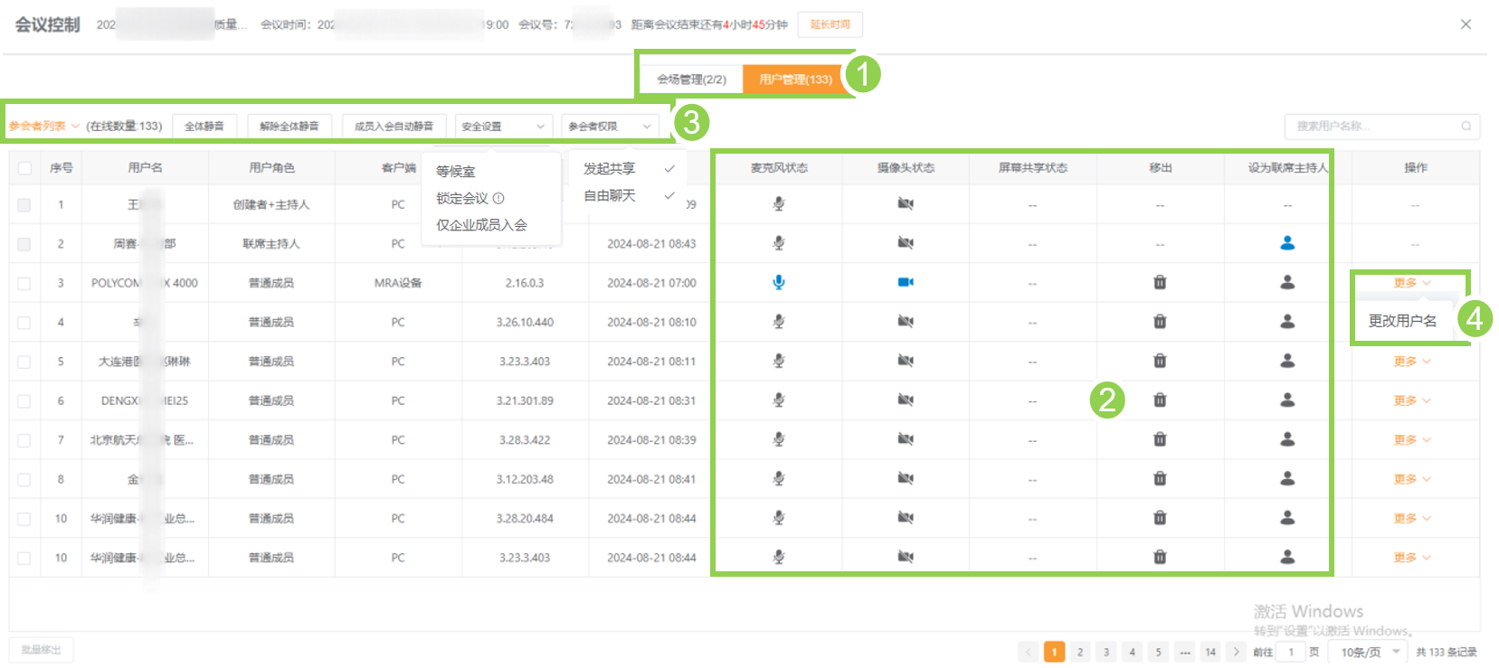 2、区域②可以对某个参会者静音或关闭摄像头、将某人踢出会议,注意解除静音和开启摄像头需要用户同意。也可以通过④修改用户名。