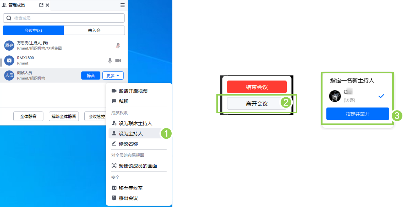 - 会议未结束,主持人离开会议请选择②离开会议,③未转权限时离开会议会提醒主持人转移权限。